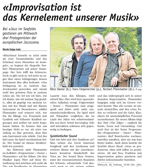 Lauscht man den Klängen, wird schnell klar. Hier wird kein egozentrisches Aufsehen erregt. Feigenwinter – Oester – Pfammatter sind eingespielt und dabei nicht mehr auseinanderzudividieren. Ihr Spiel wird mit Telepathie verglichen, die im Laufe der Jahre wie selbstverständlich aus ihrer Arbeit hervorging. Solo und Interaktion scheinen sich gegenseitig zu bedingen. Symbiotischer Sound Und wie hört sich ihre Symbiose an? Man nehme das Great American Songbook und den Jazzkanon und reichere diesen mit der unverkennbaren kreativen Handschrift des Trios an. Der Sound Bänz Oesters, einer der renommiertesten Bassisten der Schweiz, schmeichelt. Und dennoch wagt er mit seinem soliden Spiel zugleich Experimente. Pianist Hans Feigenwinter beschäftigt sich mit Kompositionsarbeiten und er vertonte einige Hörspiele. Folglich kennt er sein Handwerk von der Pike auf und das widerspiegelt sich in seiner dezenten Improvisation. Pfammatter hingegen zeigt sich im Groove versiert kreativ. Was alle vereint, ist niemals abzudriften und den roten Faden zu verlieren und die Gabe, Klassikern ihr unerschöpfliches Potenzial anzuerkennen. Ihr neues Album trägt den Titel «The Edge» – englisch für Kante, Saum und Umrandung. Und auch hier ist der Name Programm: Bei «Feigenwinter – Oester – Pfammatter» darf Bestehendes wachsen, zuweilen ausufern, aber nie aus dem Ruder laufen. Auch darin besteht die Qualität dieser Band, etwas zu produzieren, ohne sich selbst zu produzieren. Alt und Neu, Tradition und Improvisation gehen synchron und dürfen nebeneinander bestehen.