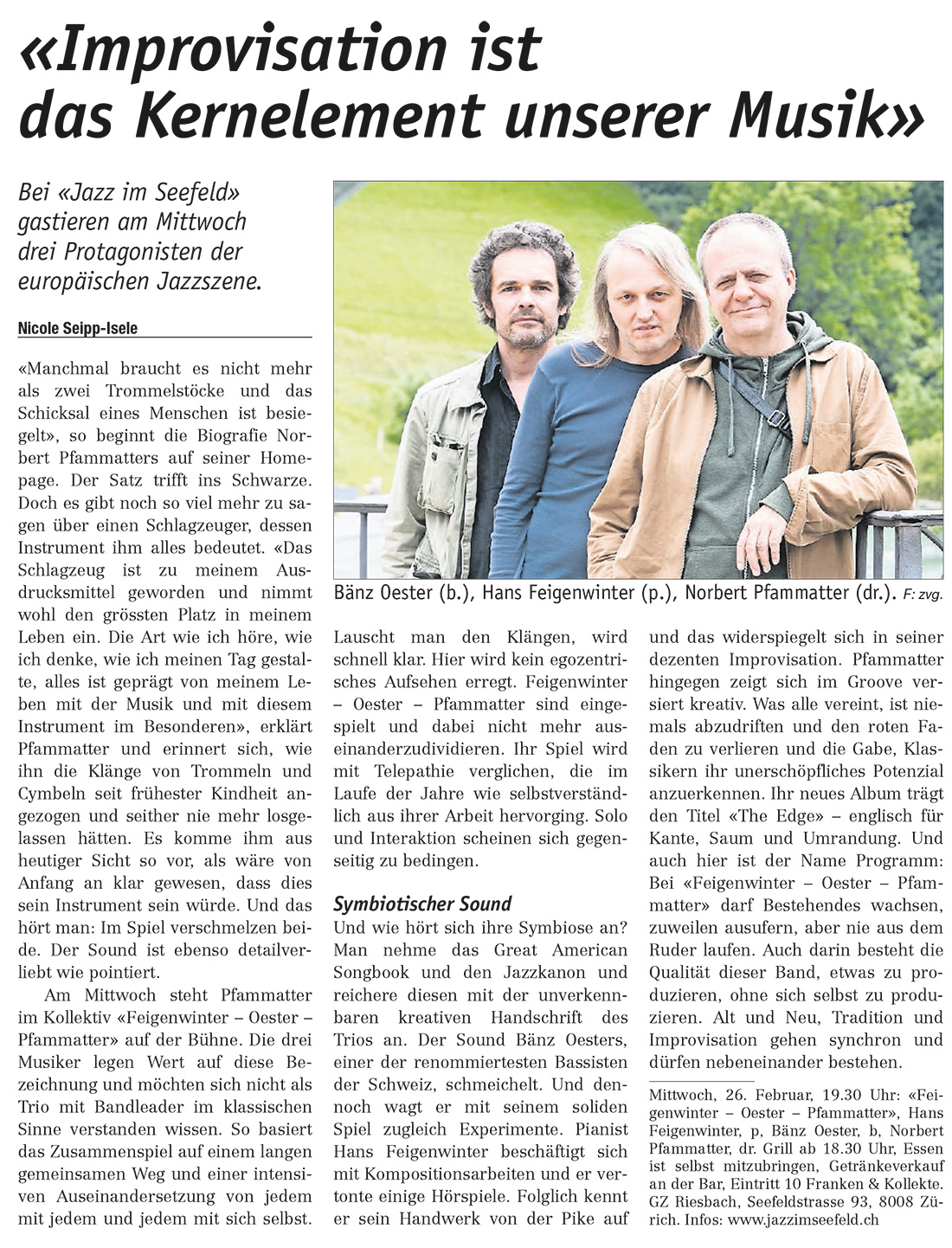 Mittwoch, 26. Februar, 19.30 Uhr: «Feigenwinter – Oester – Pfammatter», Hans Feigenwinter, p, Bänz Oester, b, Norbert Pfammatter, dr. Grill ab 18.30 Uhr, Essen ist selbst mitzubringen, Getränkeverkauf an der Bar, Eintritt 10 Franken & Kollekte. GZ Riesbach, Seefeldstrasse 93, 8008 Zürich. Infos: www.jazzimseefeld.ch